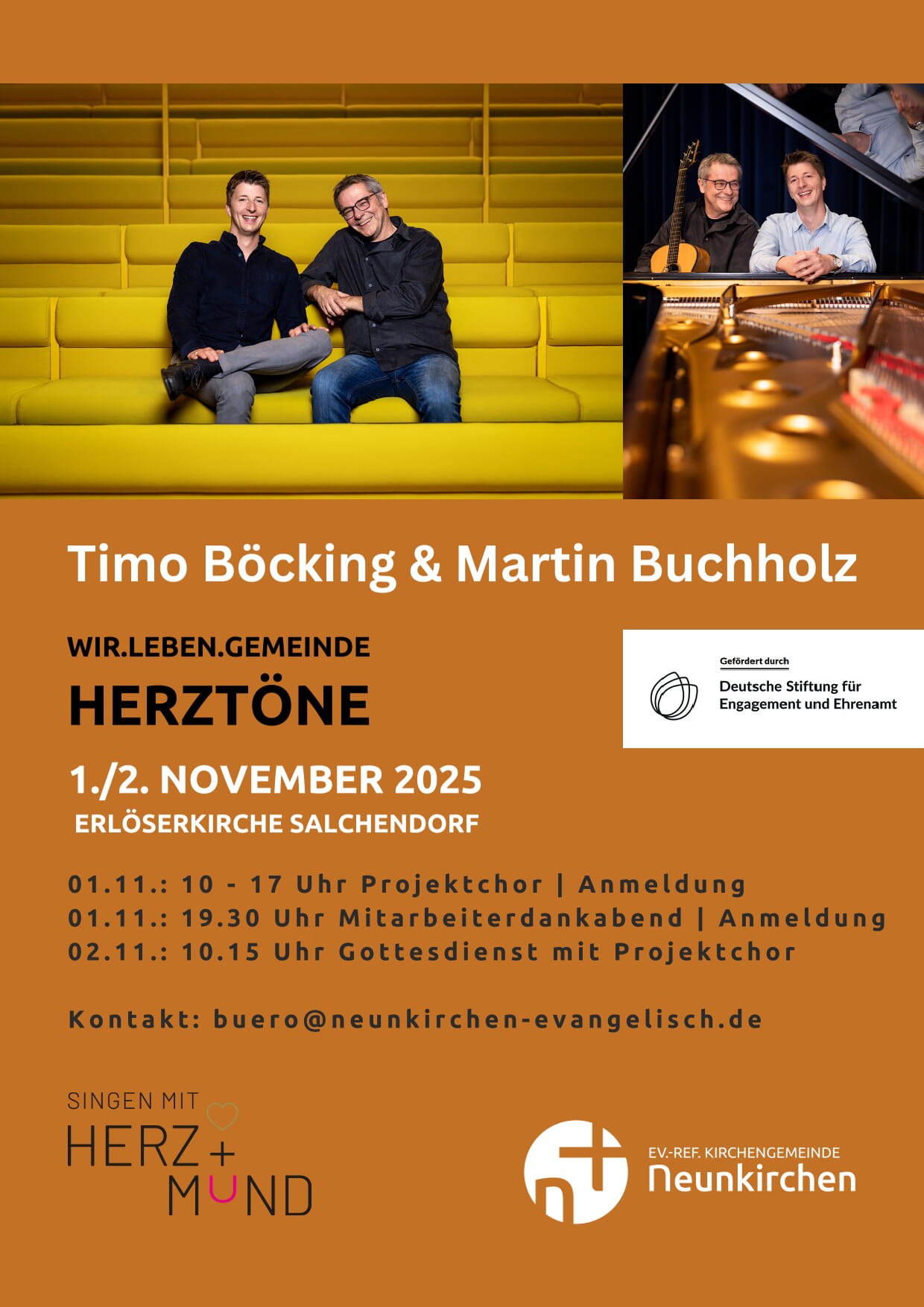 Musik zum Aufatmen, Lieder zum Mitsingen mit Martin Buchholz & Timo Böcking. Erleben Sie einen Abend, der unter die Haut geht und das Herz weit macht! Songpoet Martin Buchholz und Pianist Timo Böcking laden Sie ein zum „Singen mit HERZ+MUND“ – einem Konzert, das mehr ist als nur Musik.