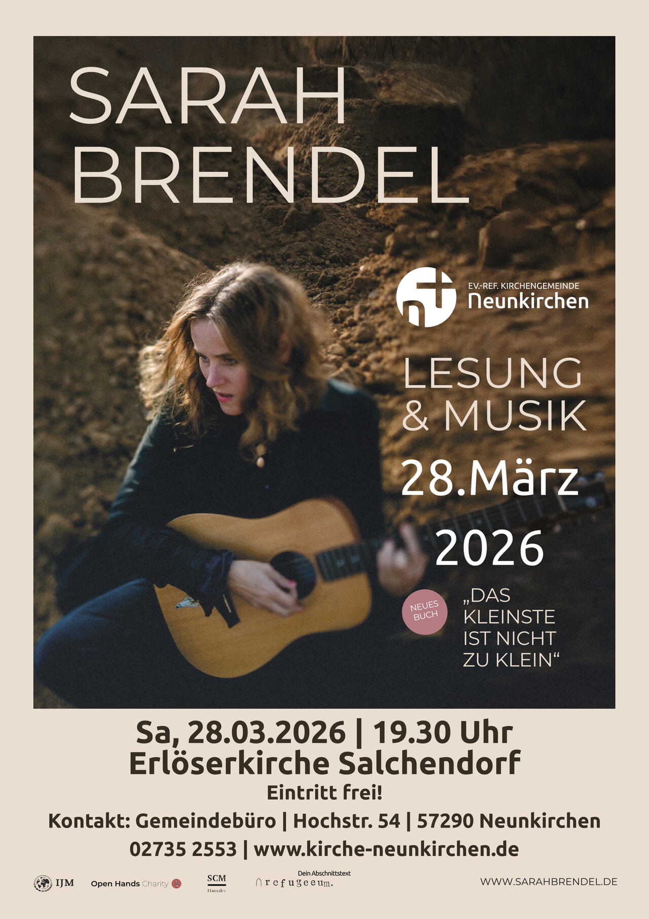 Bekannt für ihre tiefgründigen Texte und ihre klare, einfühlsame Stimme, schlägt die Musikerin und Autorin Sarah Brendel in ihrer Konzert-Lesung Brücken zwischen Alltag und Spiritualität.